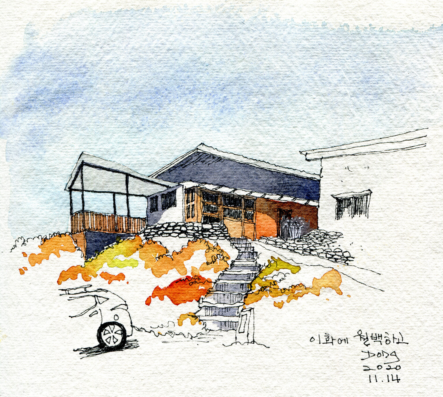 채색을 마치고 다시 길을 걸었다. 아침부터 산불조심 깃발을 단 차량이 수시로 오가더니, 그중 한 아저씨는 오토바이를 타고 지나가며 나에게 인사까지 남겼다. 그리고 김장을 준비하는 또 한 집을 보았다. 이미 절인 배추는 마당 한쪽에서 물기를 빼고 있었고 고무장갑을 낀 가족들은 분주히 오갔다. 김장 때문에 도시에 사는 자식들까지 시골집을 찾은 듯 보였다.