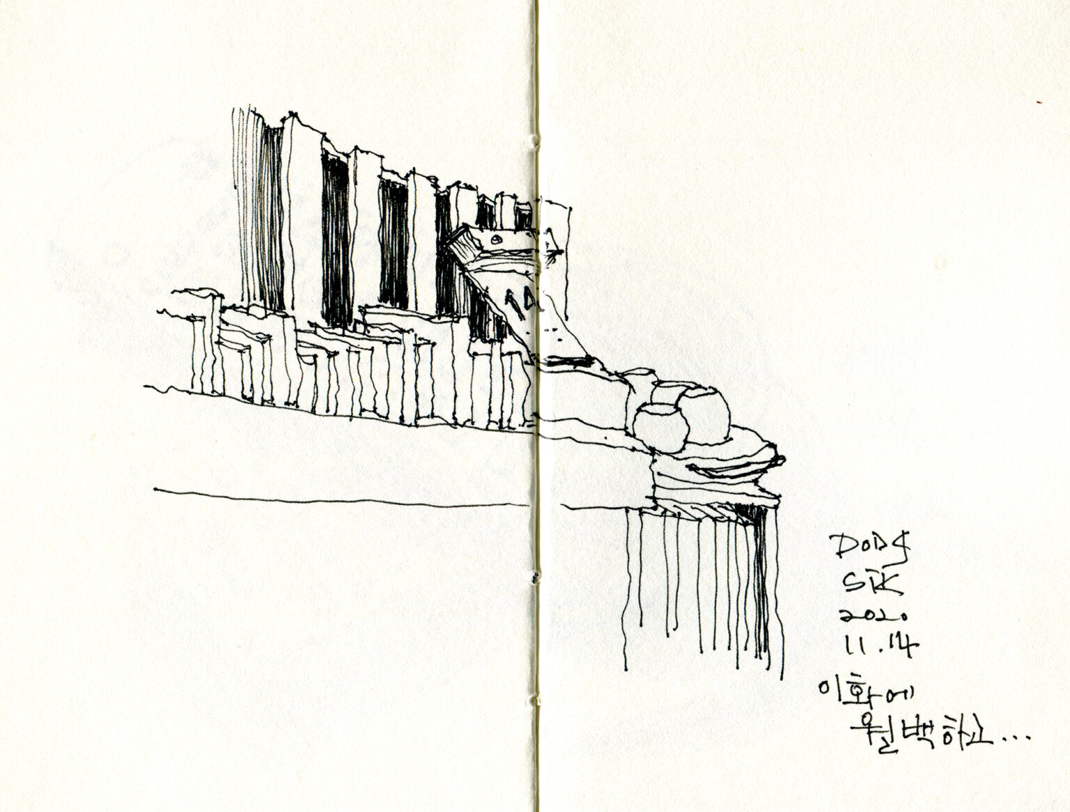 커피 한 잔 마시기에는 조금 오래 앉아 있었다. 주섬주섬 짐을 챙겼다. 밖에도 테이블이 있었다. 돌아가겠다는 마음은 어쩌고, 다리 밑에서 양파가 말라 가는 의자에 다시 앉았다. 그리고 또 하나의 스케치를 마치고서야 자리를 털고 일어났다.
