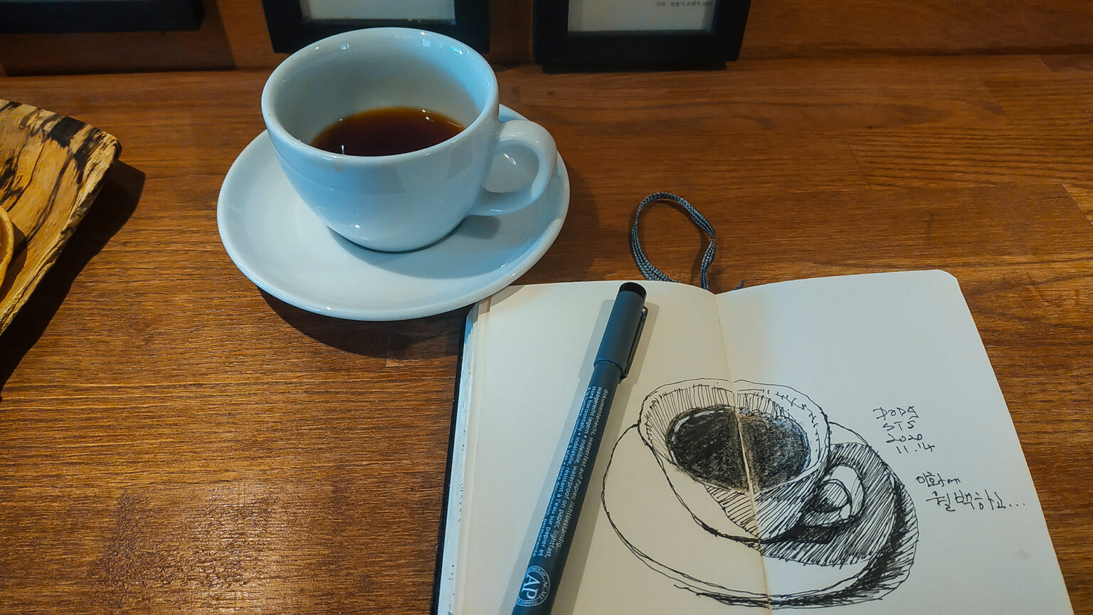 커피는 모두 핸드드립 커피였다. 아직 마셔보지 못한 코스타리카 커피를 주문했다. 커피가 나오는 사이 얼렁뚱땅 실내 일부를 스케치했다. 잠시 후, 앞에 놓인 하얀 커피잔. 코스타리카 커피는 신맛과 쌉쌀한 맛이 적절하게 조합되어 있었다.