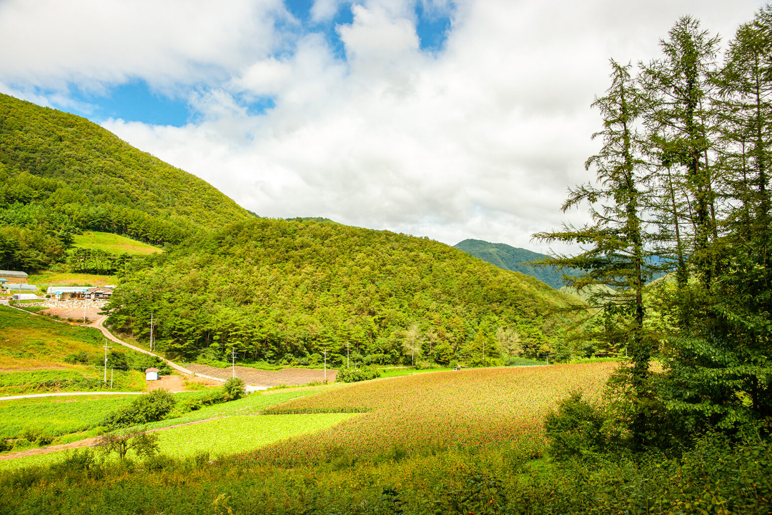 재치산을 중심으로 한 한탄리는 석회암 지역으로 지형 설명 안내판을 보지 않는다면 전형적인 산골 오지 마을로 밖에 보이지 않는다. 마을 끝, 길이 없어 보이는 곳에 숨어 있듯 산으로 향하는 길이 또 있었다. 고갯마루를 넘으니 드디어 고마루가 한 눈에 보인다. 숲 가운데 옴폭한 곳에 집과 밭이 자리한 풍경이 영락없이 울릉도 나리분지의 미니어처다. 마을 깊숙이 들어가 고개를 들고 보니 눈앞에 여백 없이 하늘이 꽉 찼다.