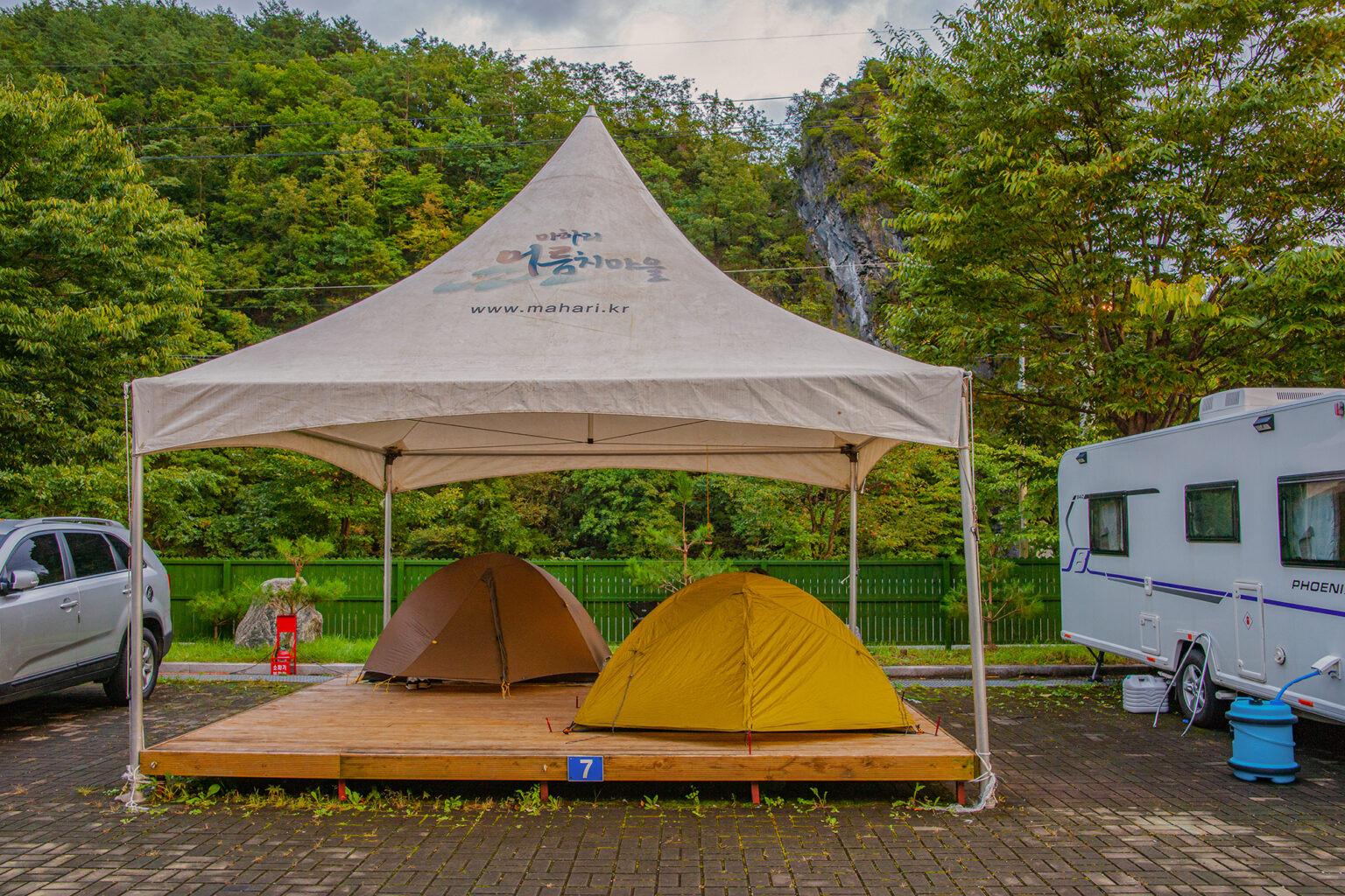 2) 어름치마을 캠핑장 : 홈페이지 예약 가능, 카라반 5대와 캠핑용 데크 10개