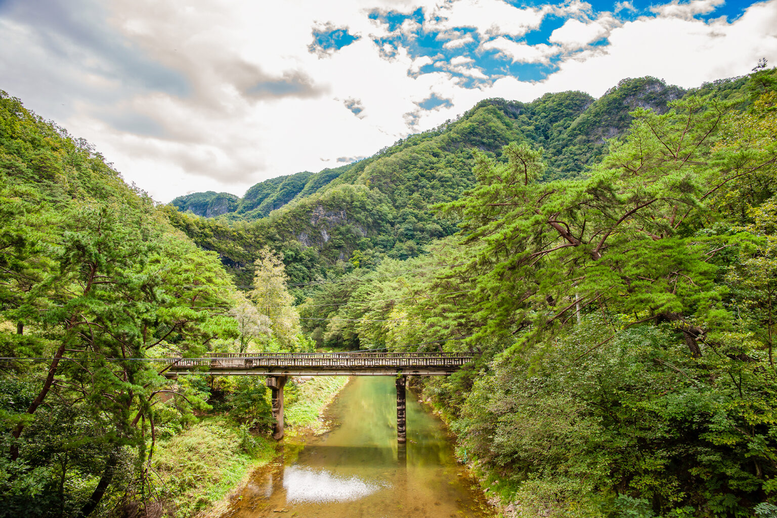잊혀져가는 옛 풍경을 보기 위한 길. 차량 진입을 못하게 커다란 돌 5개를 차단봉 역할로 놓은 옛 도로가의 가로수가 벚꽃나무다. 꽃 피는 계절에는 연분홍 꽃잎이 날리며 예뻤을 것을 상상해 본다. 몇 걸음이나 떼었을까, 그새 다리 앞에 섰다. 난간에 덕지덕지 붙어 자라는 넝쿨과 이끼가 말해주듯 쓰임새를 다한 기화1교다. 안전 진단을 받은 후 몇 년 전부터 사용이 금지된 다리 너머로 목적했던 곳이 보인다.