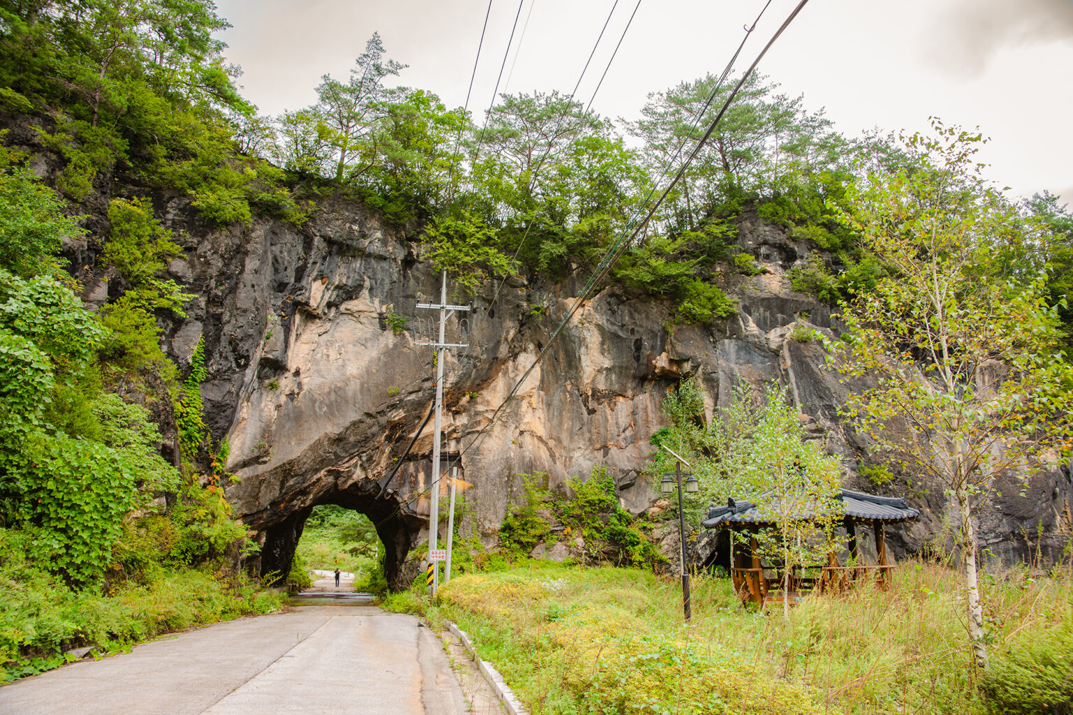 커다란 기암을 뚫어 만든 옛 기화터널은 한 때 절벽에 갇힌 마을들을 통하게 하는 대문 역할을 했다. 전북 무주의 나제통문(羅濟通門)이 신라와 백제를 이어주던 문의 역할을 했다면 옛 기화터널은 읍읍통문(邑邑通門)이라고 해야 하나. 천정에서 한 두 방울씩 떨어지는 물을 피해 터널 안으로 들어갔다. 고개를 쳐들어 살펴보니 끌과 정으로만 뚫었는지 다이너마이트를 터트린 구멍의 흔적이 보이지 않는다.