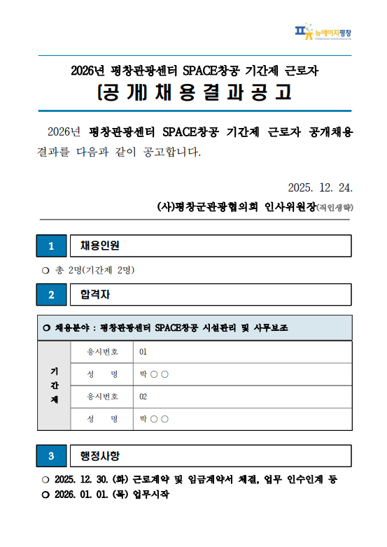 2026년 평창관광센터 기간제 근로자 합격자 공고