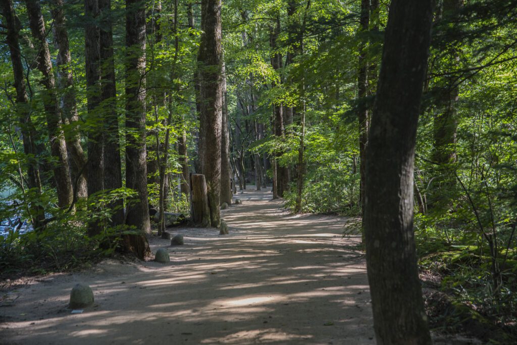 오대산국립공원의 전나무 숲길에는 40m까지 곧게 자란 수령 500년 이상의 아름드리 전나무들이 우거져 있다. 월정사 못지않게 유명한 오대산 탐방 명소로, 피톤치드가 가득하여 삼림욕을 하기에 더할 나위 없이 좋다. 길이 완만한 덕분에 가볍게 산책할 수 있으며, 전나무가 시원한 자연 그늘을 만들어 주어 더위를 피하기에 딱 적합한 장소다.