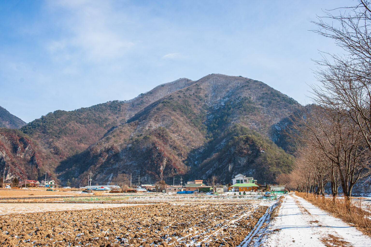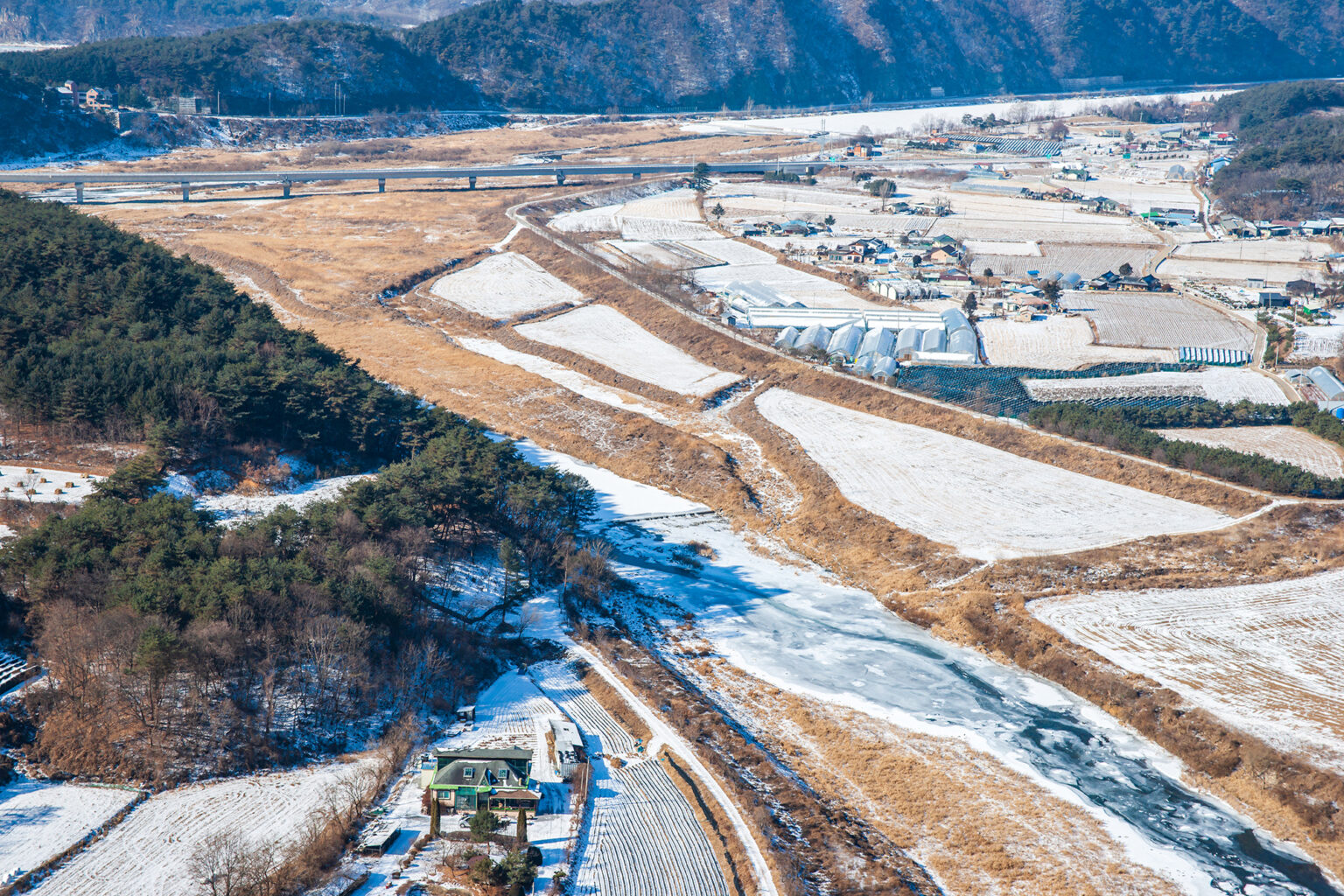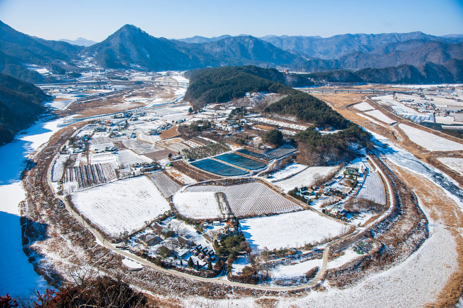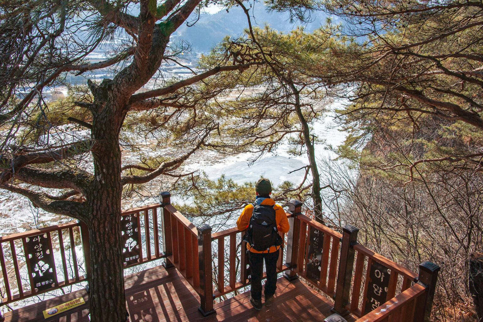 차를 타고 31번 국도의 터널을 지나 천동리로 향했다. 마을 입구에서 황종사와 절개산이라는 이정표를 보고는 들어가는데 ‘이 길이 맞나’ 싶을 정도로 한참을 들어가서야 주차장에 닿았다. 등산로 입구에서 20여분쯤, 이정표를 따라 뼝대 전망대 위로 향했다. 전망대에서 보는 매화마을은 물돌이 마을이다. 우리나라의 물돌이 마을은 낙동강과 금강이 만들어낸 곳들인데 이제부터는 평창강도 한 곳 추가다. 게다가 조금 찌그러진 형태를 하고 있지만 한반도의 형상까지 하고 있다. 눈이 하얗게 덮인 마을은 고요한 그림을 보는 듯 잔잔했다. 누군가 알려주지 않았더라면 몰랐을 마을 이야기 등 길은 무언의 가르침과 절경을 보여주니 걷는 즐거움은 이어진다.