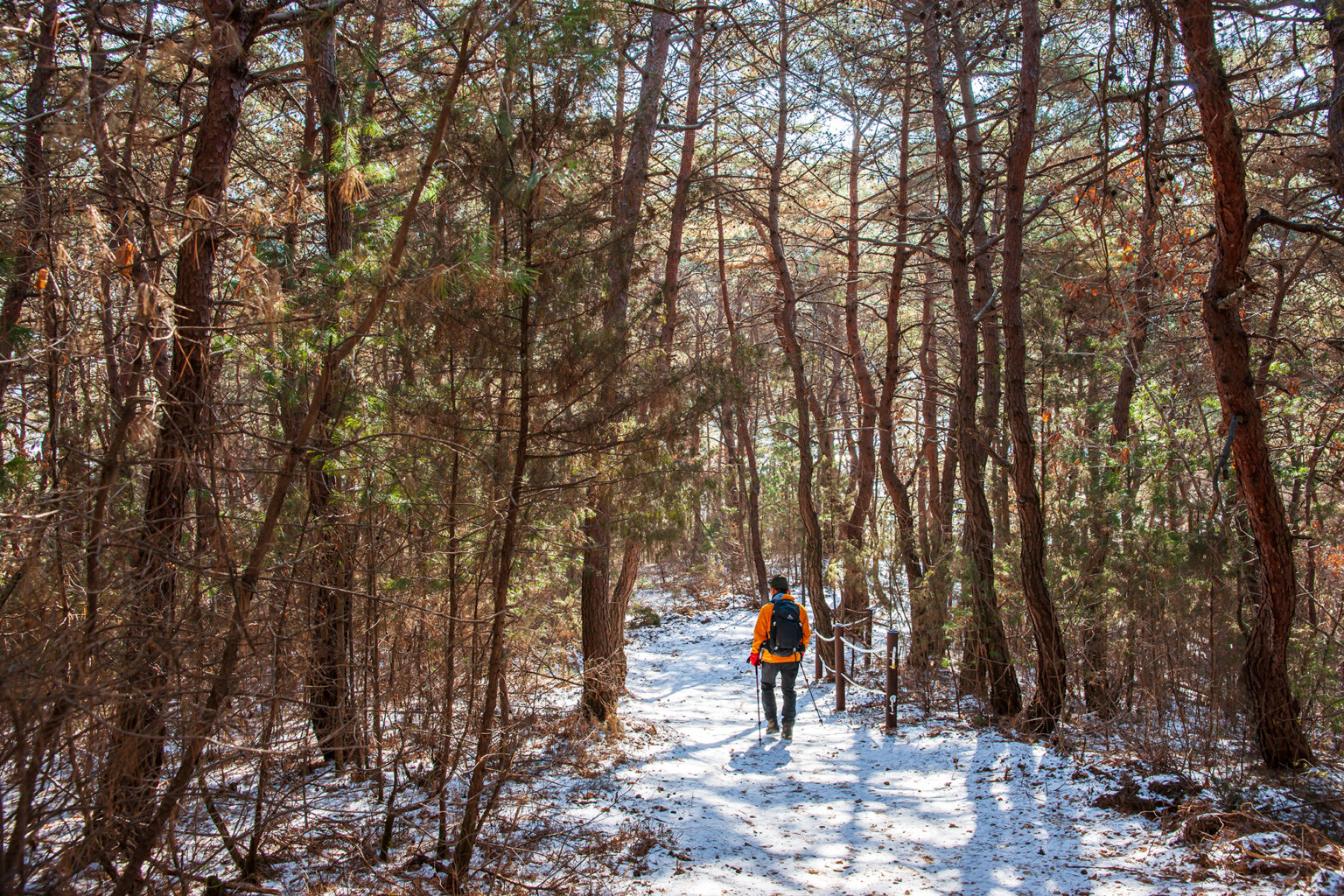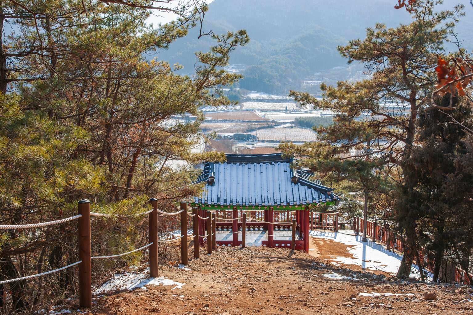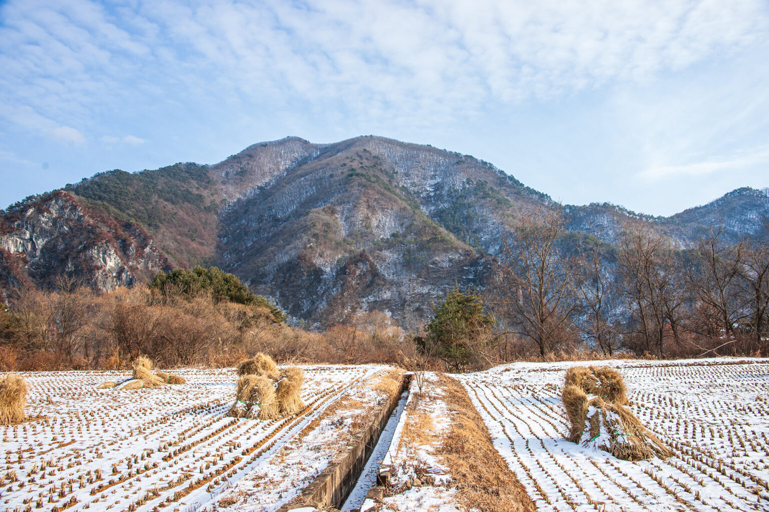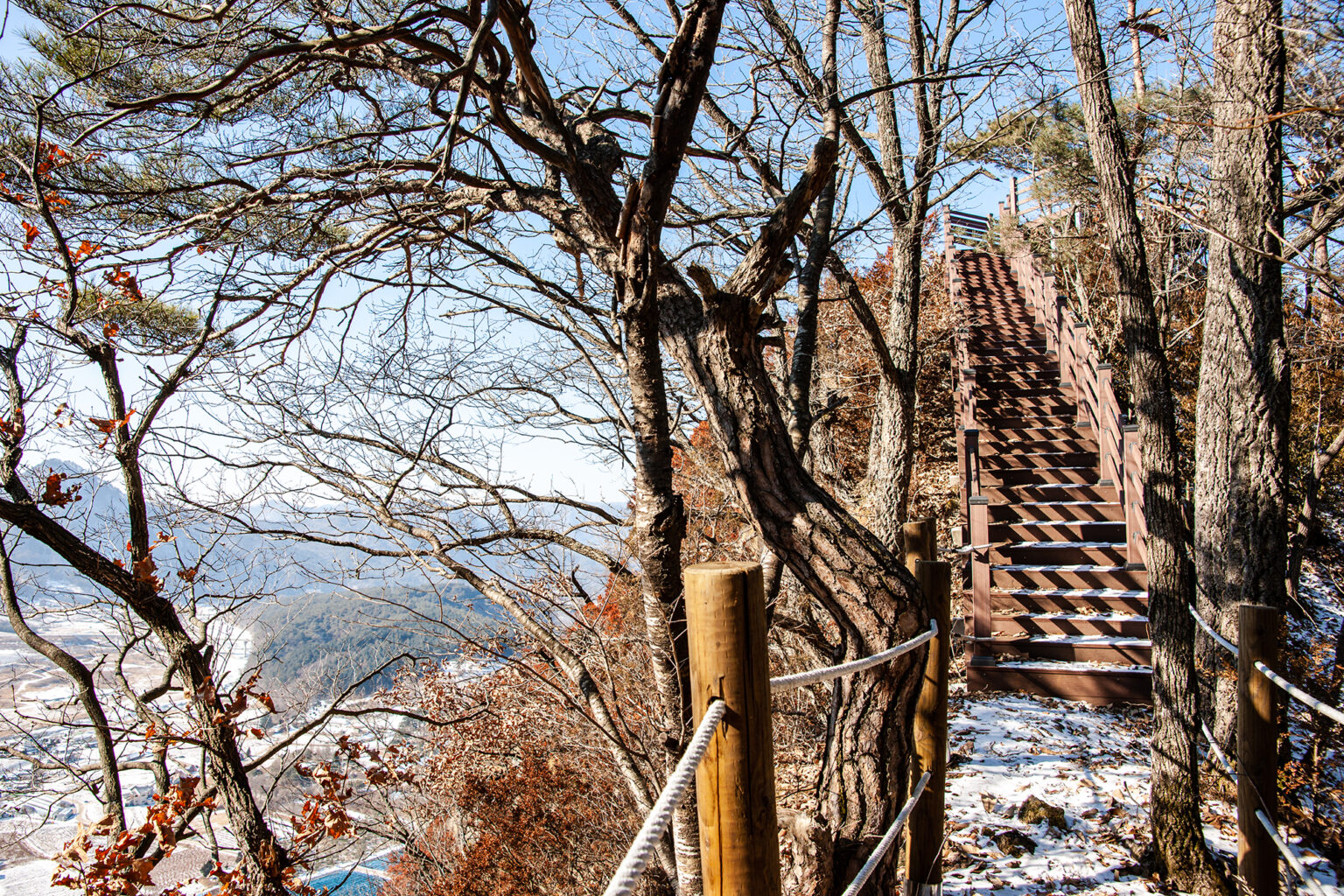 차를 타고 31번 국도의 터널을 지나 천동리로 향했다. 마을 입구에서 황종사와 절개산이라는 이정표를 보고는 들어가는데 ‘이 길이 맞나’ 싶을 정도로 한참을 들어가서야 주차장에 닿았다. 등산로 입구에서 20여분쯤, 이정표를 따라 뼝대 전망대 위로 향했다. 전망대에서 보는 매화마을은 물돌이 마을이다. 우리나라의 물돌이 마을은 낙동강과 금강이 만들어낸 곳들인데 이제부터는 평창강도 한 곳 추가다. 게다가 조금 찌그러진 형태를 하고 있지만 한반도의 형상까지 하고 있다. 눈이 하얗게 덮인 마을은 고요한 그림을 보는 듯 잔잔했다. 누군가 알려주지 않았더라면 몰랐을 마을 이야기 등 길은 무언의 가르침과 절경을 보여주니 걷는 즐거움은 이어진다.