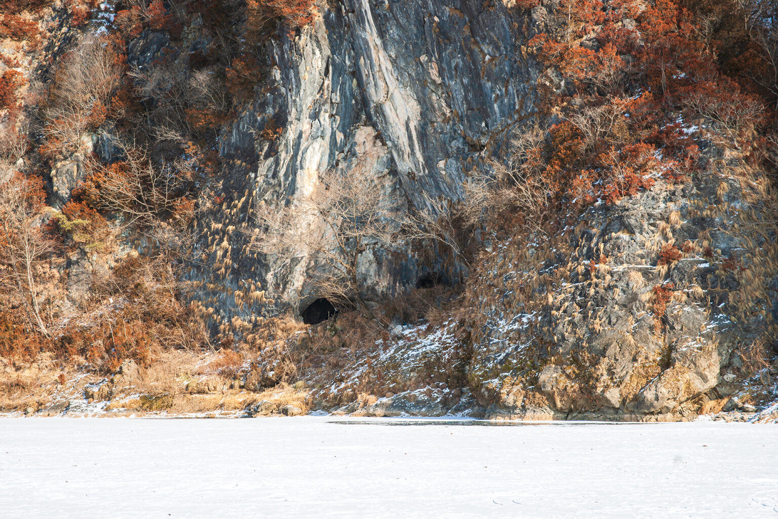 강변길을 따라 걷다가 김삿갓 시비를 만났다. 그가 고향인 영월 하동으로 가다가 이곳 평창강의 경치에 발목이 잡혀 하룻밤을 자고 떠났다고 할 정도로 이곳의 풍경은 깊고 광대하다. 한길 낭떠러지 뼝대 절벽에서 자라는 풀과 나무가 겨울을 나기 위해 갈색으로 변한 모습은 누군가 일부러 붓으로 점을 찍어 놓은 듯 그윽하다. 좀 더 가까이 보고 싶어 기어이 강물 위에 올라섰다. 얼어버린 평창강 위로 하얗게 쌓인 눈 위는 짐승의 발자국만 어지럽다. 한 발 한 발 내딛는 걸음은 은근 심장이 쫄리는 긴장감으로 걸음 폭이 자유롭지 못하다. 혹여 얼음이 깨져 강물에 빠질까 싶은 두려움이지만 눈앞 풍경은 그런 걱정을 잠시 잊게 할 만큼 절경이다.