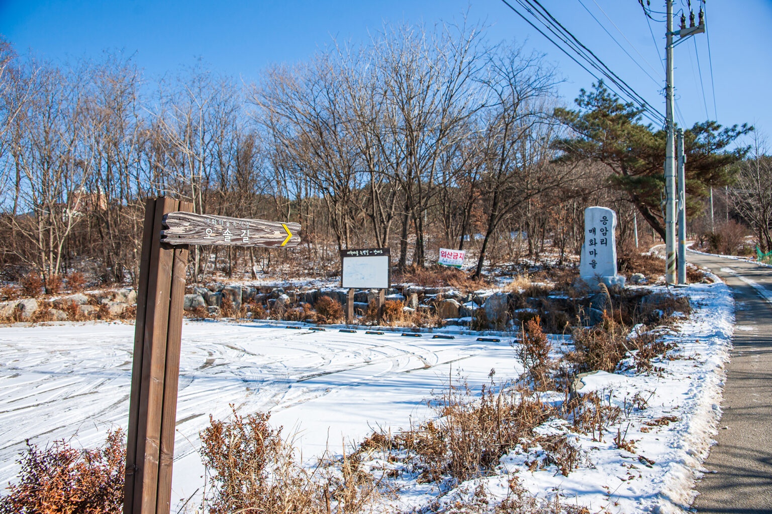 – 마을 입구 주차장 있음, 녹색길 안내 표지판 있음