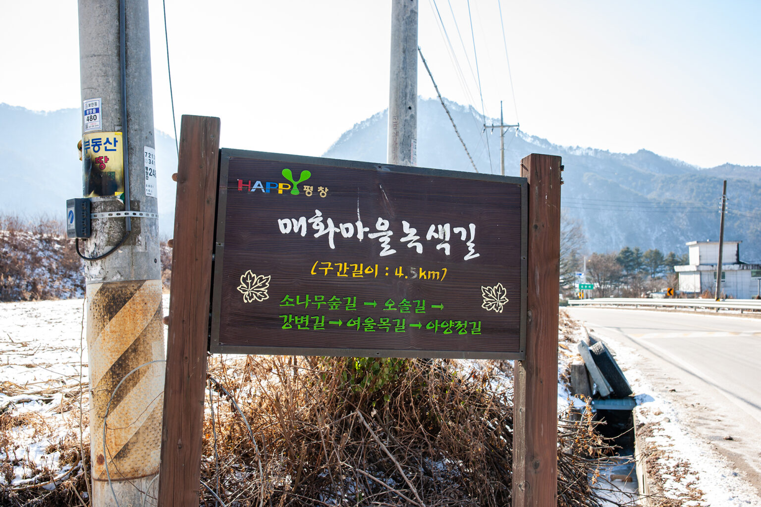 코비드 19로 인한 시절의 답답증으로 콧바람을 넣고 싶었다. 사람들을 대면하지 않는 곳을 찾아 떠나는 길. 언젠가 걷기 트레일에 점찍어 놓았던 평창군 매화마을로 목적지를 삼았다.
