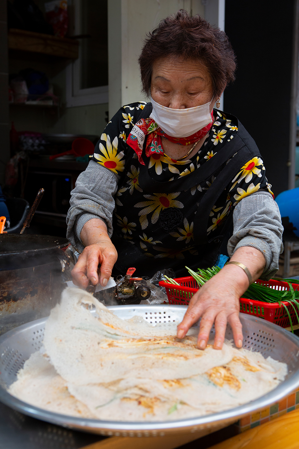 메밀나라의 한임직 할머니는 메밀부침을 부친지 올해로 48년 째다. 시장건물이 없던 시절부터 비닐 포장을 치고 장사를 시작했다. 장날이 아니어도 매일 문을 열었고 그때 걸린 동상 때문에 아직도 다리가 불편하다.