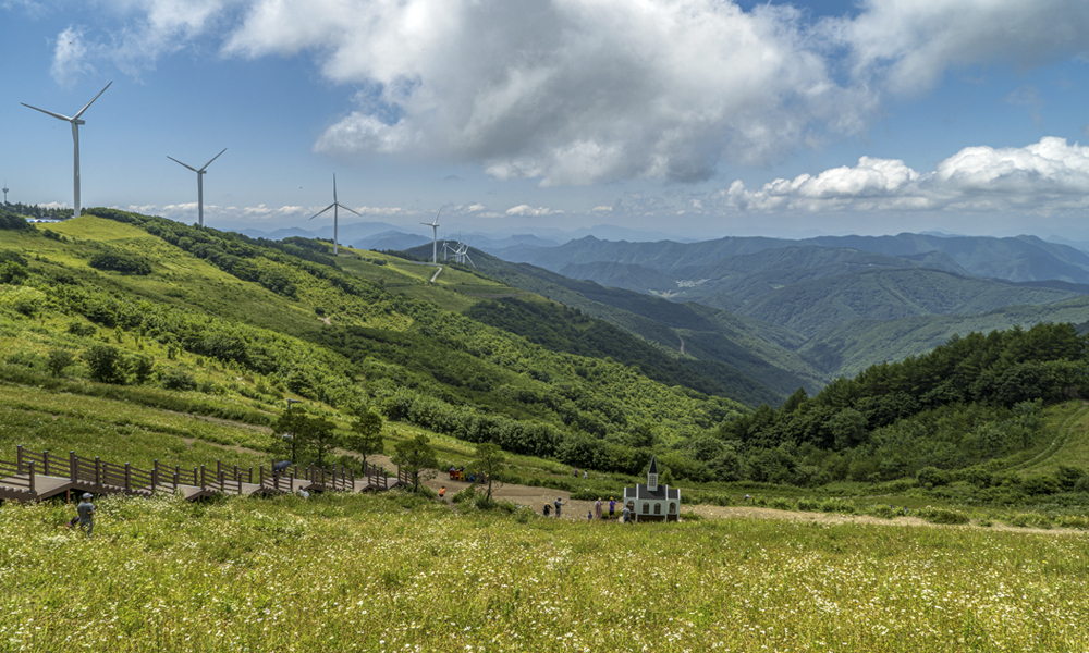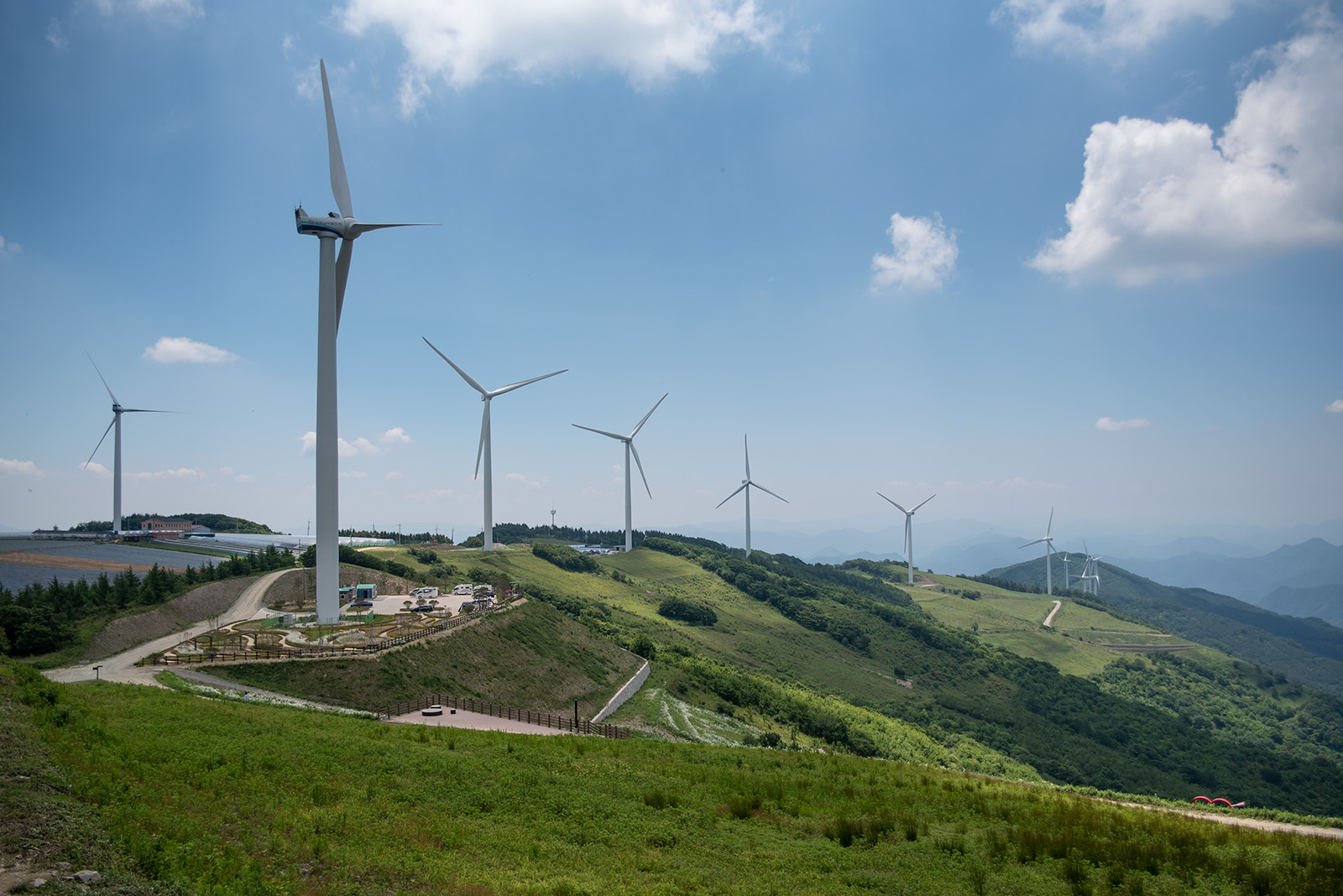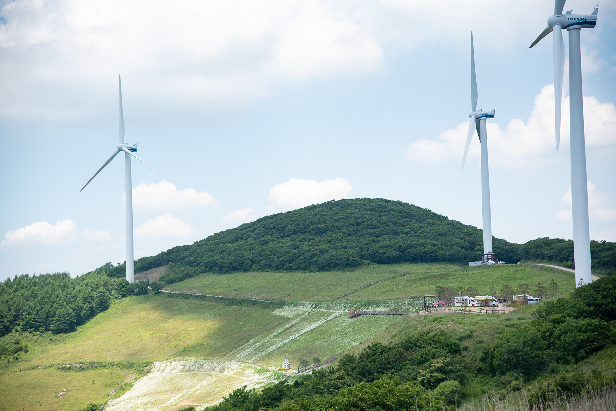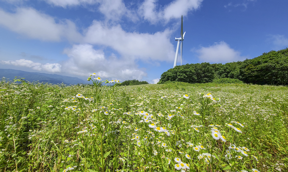 풍력발전기 풍경 – 능선 주변에 설치된 풍력발전기와 파란 하늘이 어우러진 모습이 독특한 포토 스팟이 됩니다.